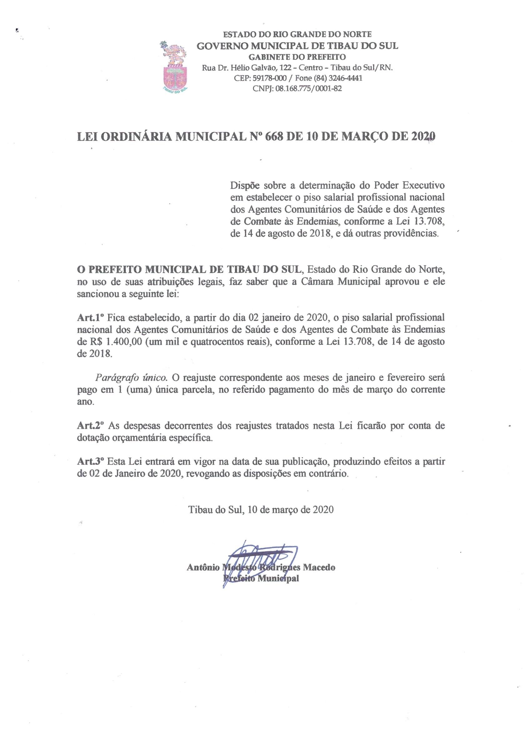 Lei Municipal nº 668 De Março De 2020