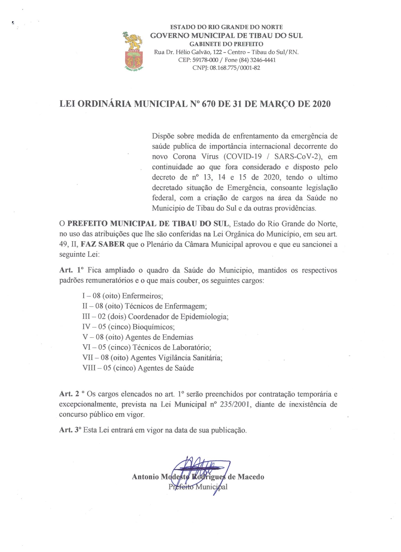 Lei Municipal nº 670 de 31 De Março De 2020